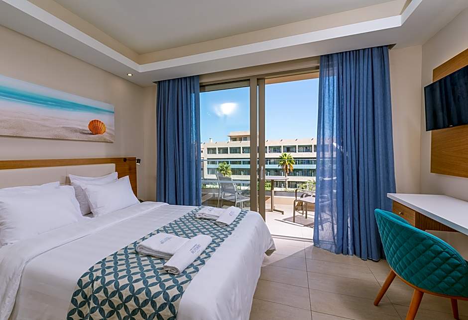 This bright and airy room is air-conditioned and has a 21-inch satellite TV, safe and a mini fridge. It opens to a balcony with views across the Aegean Sea and the contrasting hillside.